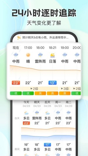 3、24小时逐点追踪:提供24小时逐点天气追踪功能,让用户清楚了解即将到来的天气变化。 这对于需要密切关注天气变化的用户来说尤其重要。