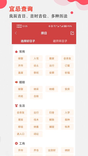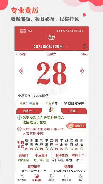 权威的黄历信息、每日宜忌、每日运势、黄道吉日、干支历、公历等。