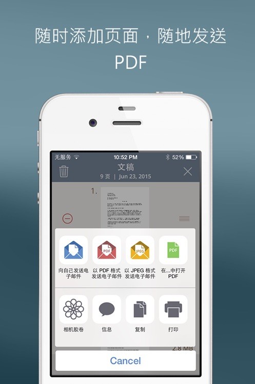 通过电子邮件或信息发送 PDF、JPEG 或 PNG 格式的文稿,或将文稿保存至照片中。