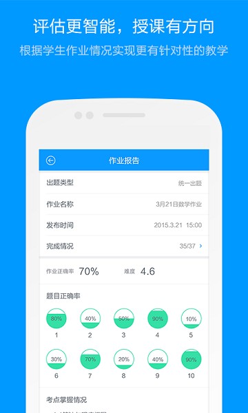 1、专为教师设计的手机教学软件,帮助教师全面分析学生对知识点的掌握情况,进行针对性的教学。