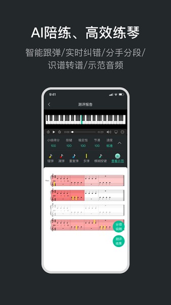 用户可以通过APP的引导,边看谱边跟弹,并支持分手/分段等多种练习方式,实现音符与演奏的同步。