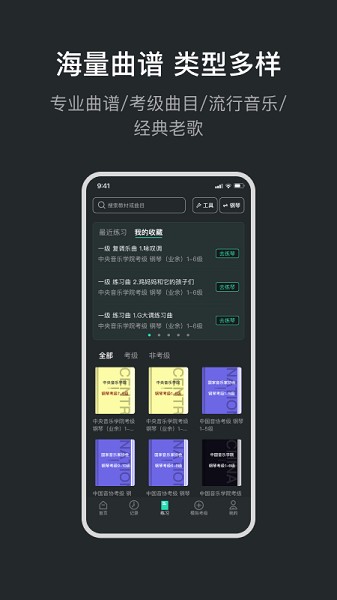 提供丰富的书籍和曲目选择,包含专业曲谱、考级曲目、流行音乐、经典老歌等,用户可根据个人兴趣和需求进行针对性练习。