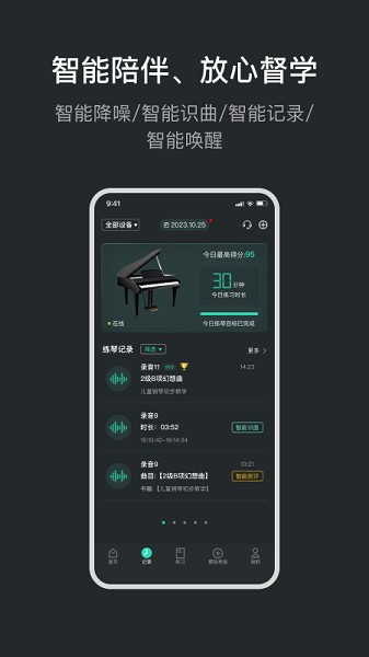 2、线上可以通过智能技术提升练琴督学效果,帮助用户有效增加练琴时长,确保练习的效率。