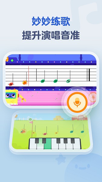 独家创编儿歌童谣,结合AI智能识别技术,帮助发现音准问题,掌握不同的旋律乐曲,实现识谱能力演唱能力的全面突破,提升音准的敏感度和正确表达能力。