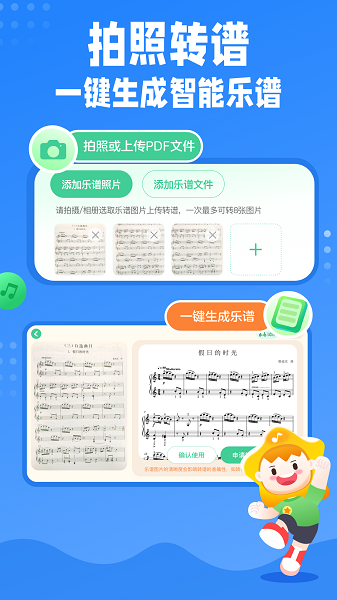 支持拍照&上传PDF文件,一键生成智能乐谱,再也不用为找谱而烦恼啦!