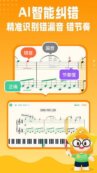 小星星A陪练可以准确识别错音、漏音、错节奏,弹对音符变绿,弹错会有小键盘提示,实时反馈及时纠正,快速提升识谱能力!