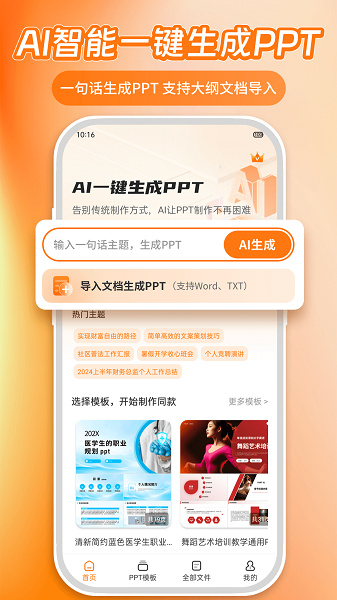 1、一键生成PPT,用户只需输入内容或选择主题,就能自动生成完整的演示文稿框架。