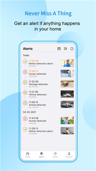 4、报警功能:如果摄像机检测到异常移动或声音,应用程序将向用户发送报警,并实时接收检测报警信息。