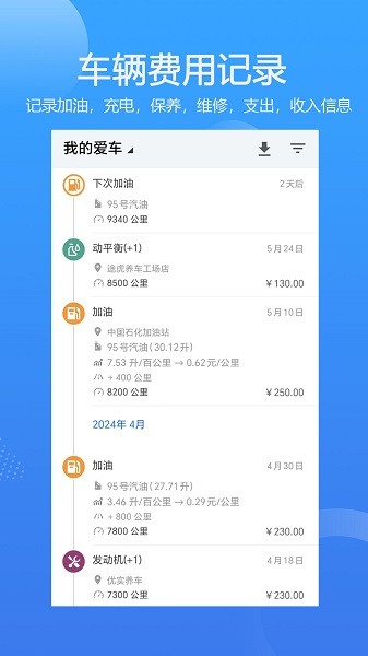 车辆的加油,充电,保养,支出,收入,维修费用记录。