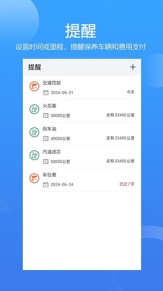 设置时间或公里数,提醒车主保养车辆或支出费用。