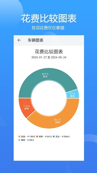 分类统计车辆花费和收入,生成清晰图表,每月开支图表,花费比较图表,里程表图表,燃油效率图表,加油站图表等10多种图表。