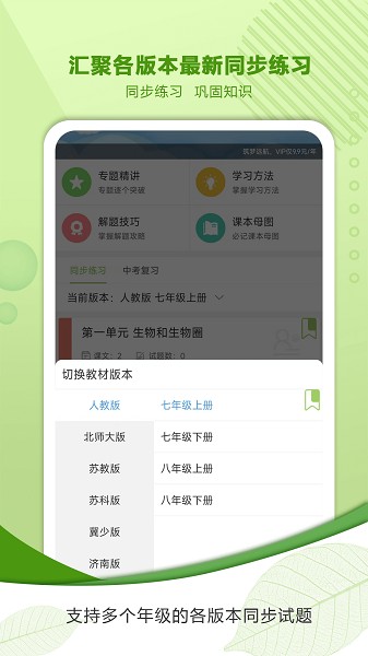 支持初中生物人教版、初中生物北师大版、初中生物苏科版、初中生物苏教版、初中生物冀少版、初中生物济南版等多个版本的年级同步试题。