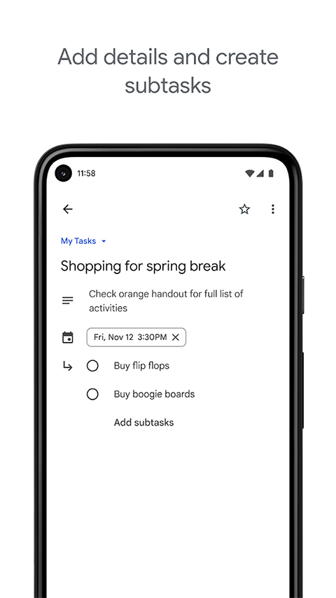 Google Tasks是一款由Google推出的任务管理软件,旨在帮助用户提高工作效率并更好地管理日常任务。支持中文界面显示,对国内用户非常友好,并且与谷歌日历、Gmail等谷歌服务紧密结合。支持跨设备同步,保证用户可以在手机、平板或电脑上随时访问和访问内容,用户可以创建任务并设置名称、描述、截止日期,并添加子任务以进行更详细的管理。无论您是个人用户还是企业用户,您都可以使用Google Tasks来优化您的工作流程和时间管理,有需要的用户直接下载就可以开始体验了。