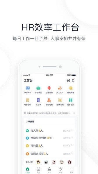 每日工作一目了然,所有待办事项、今日招聘、人事统计、人事动态尽在掌握,助你高效完成管理工作。