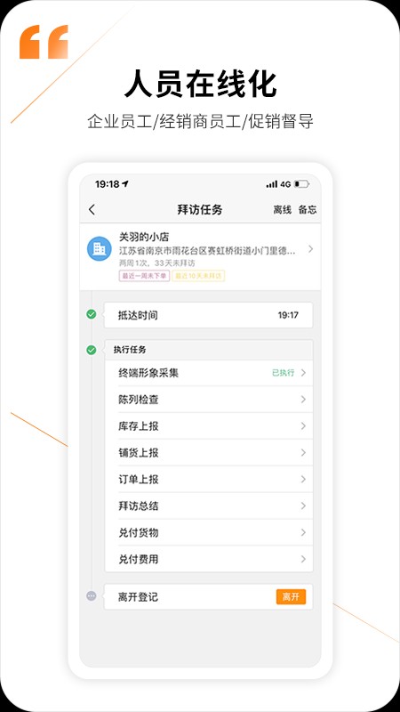 消费品行业,企业需要对业务员拜访行为进行规范化管理,掌握终端门店、库存、陈列,实现对外勤拜访的管理闭环。