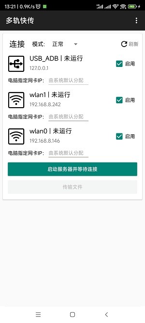 主界面选择好模式后点击按钮启动服务器并等待连接,状态显示“等待连接”后,电脑双击运行启动脚本启动_ADB连接.bat(或者你根据启动参数自己编写一个)。如果提示没有java,则需要安装java运行环境,安装过程不过多阐述,与我的世界安装java环境过程一致。ADB连接方式下,程序首先执行adb转发端口(USB通道),若电脑未授权USB调试,请点击手机上的“允许这台电脑进行调试”。端口转发完成后,启动电脑客户端,客户端先连接控制通道,然后从控制通道获取手机指定的传输通道网卡信息,然后电脑客户端连接到这些传输通道网卡,选择的线路都连接成功后,『传输文件』按钮亮起即可进行文件传输。