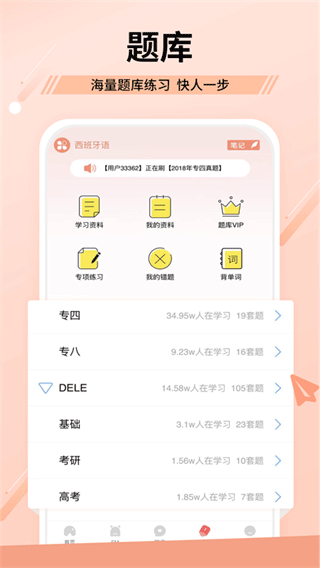 4、题库功能:提供大量真题和模拟题,包括各种语言的各个级别,方便用户了解试题类型和难度,练习答题速度。同时,用户可以在笔记圈中与同学讨论不熟悉的话题。