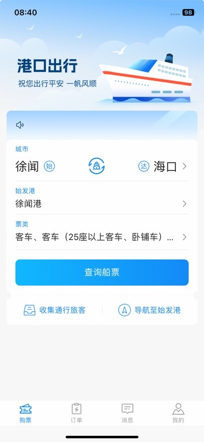徐闻港购票平台app为大家带来了全面的购票平台,能够在线规划好行程,购买往返的船票都很方便的,能够为自己以及家里人快速买到票。平台上可以查看自己的所有订单,遇到任意的问题也可以咨询客服,非常的方便。