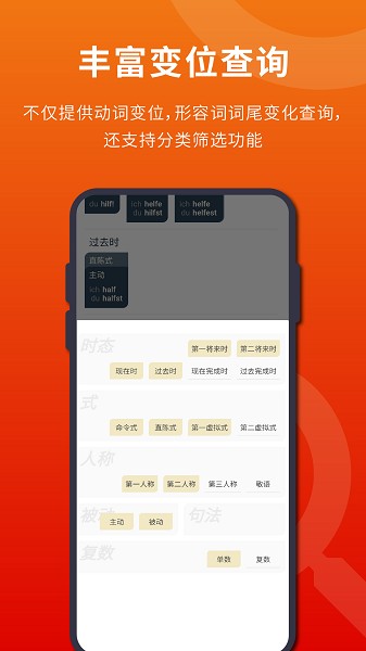 词典分别为动词,形容词,名词提供完整的动词变位表,形容词词尾变化表,单复数变化表,且具有简洁好用的筛选功能