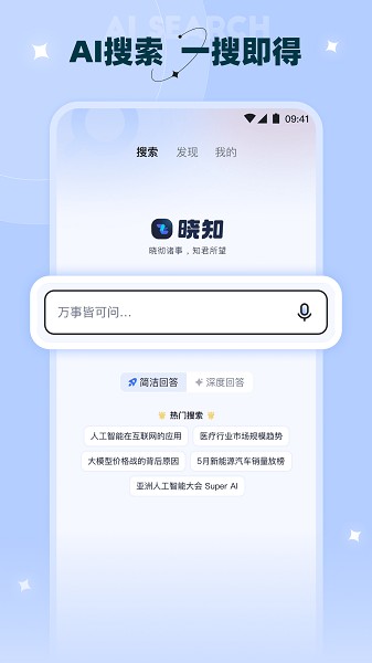 讯飞晓知app也就是星火晓知,让大家在这里自由搜索想要了解的内容,输入关键词即可进行AI搜索了,每次搜索的结果都非常的精准,自动归纳让大家无需翻阅各个网站查看答案了,使用起来都很方便 ,完全不需要进行复杂的操作,及时保存搜索内容。