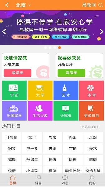 2、小编这里选择了学生,登陆后进入软件首页,用户可以看到各种相关的科目家教。