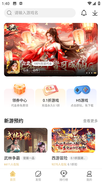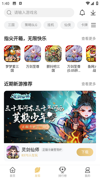 2、进入首页,汇集了很多游戏资源,包括仙侠、三国、射击以及0.1折都有。