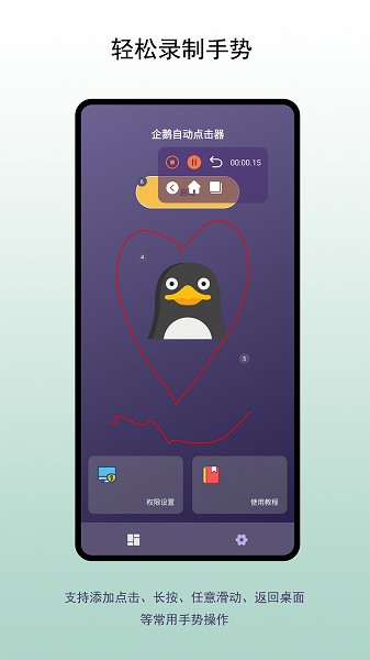 企鹅自动点击器app为大家带来了自动点击神器,在各个软件中运行自动点击脚本都非常的流畅,每次都可以根据自己的需求来录制相应的脚本,及时的进行调试,之后运行起来才能更加的流畅,自由设置每次自动点击的参数了。