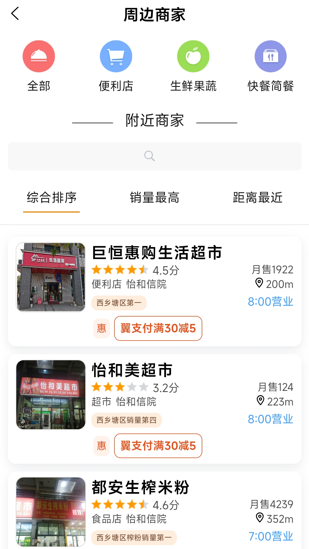 4、周边商家,整合周边商家资源,提供优惠信息和团购活动,丰富居民的消费选择。