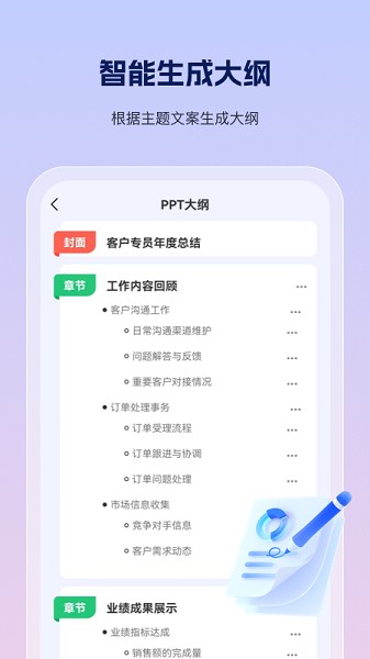 只需输入一句话或选择特定主题,即可自动生成一份精美的PPT。该功能大大节省了用户的时间和精力,让PPT制作变得轻松快捷。