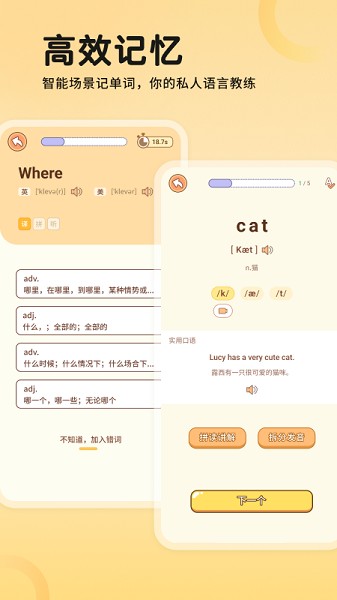 1、利用先进的人工智能技术,提供个性化的口语训练和单词助记功能,帮助用户快速提升英语听说能力。