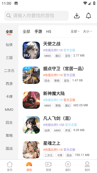 2、提供最全面的游戏,平台涵盖了仙侠、国战、H5、养成、策略等多种类型的游戏。