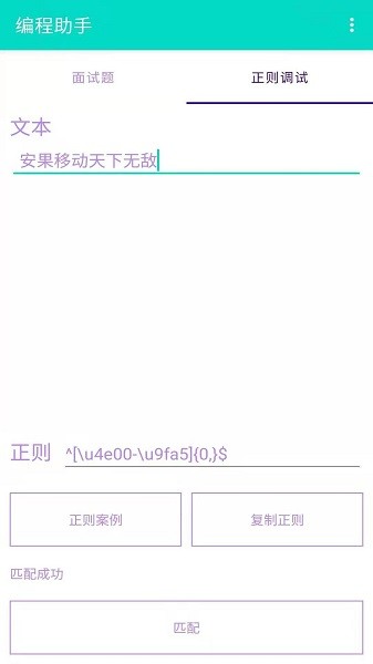 帮助用户在手机上面调试正则,内置很多正则案例,字符串相关正则,特殊需求正则。