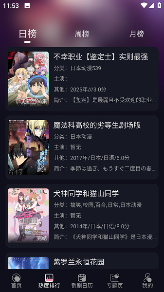 3、热度排行页面,根据当前热度将动漫进行周榜、日榜以及月榜的排序。