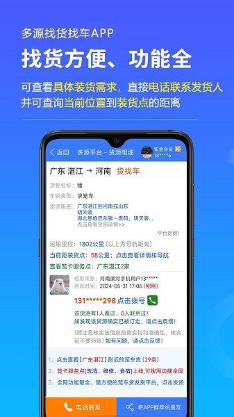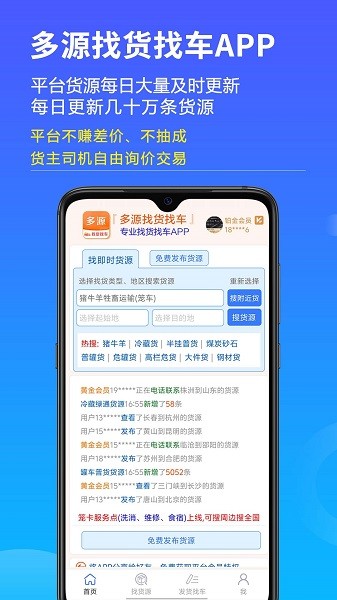 多源找货找车app为大家带来了非常全面的货源信息,全国各地的货源都可以及时的进行查询,日常运输各种货源都很方便,根据自己的需求可以快速下单,时刻监控运输货物的进度,每次运输全国各地的货物都可以来这里找货车了。