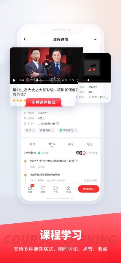 1、 课程格式支持:MP4、MP3、PPT、PPTX、doc、docx、pdf、H5、第三方链接等视频和文档。
