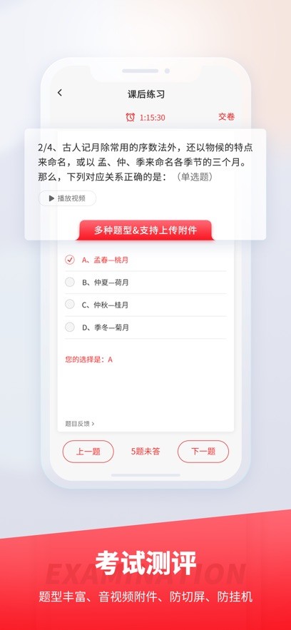 2、 题库管理:批量管理试题,支持单选题、多选题、是非题、填空题、问答题。支持图片、音频、视频类的试题。