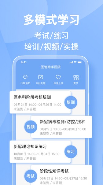 医管助手app是专门针对医院内部打造的培训平台,能够让内部人员根据需求进行培训,每天利用自己的碎片化时间在手机上轻松学习,带来的学习资源非常的全面,题库也是可以随时进行练习的,会不定时的进行更新,实时记录学习的进度。