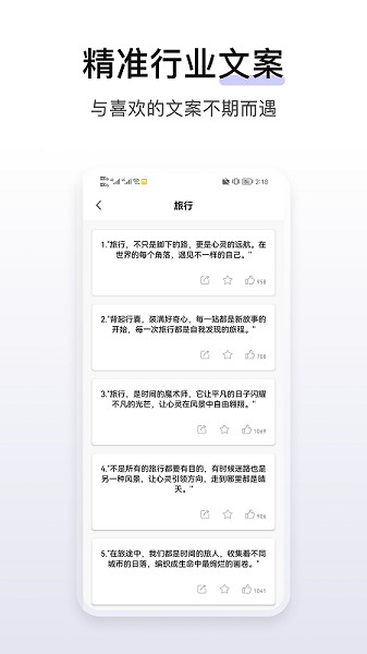 它是一个行走的文案助手,打开它你就能找到你最喜欢的文案。