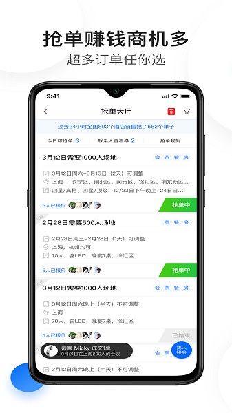 1、专为酒店销售人员设计的移动接单工具。它允许销售人员随时随地进行接单、抢单、报价以及与客户在线沟通。