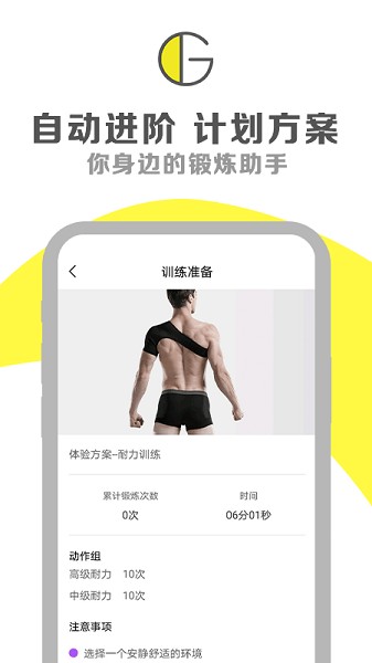 大量训练课程,炫酷的训练页面,多种声效体验,为使用者打破单调沉闷的训练方式。定时提醒,训练小贴士等功能,帮助使用者轻松坚持训练,带G动完美融入生活。