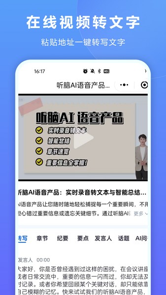 2、无论是本地上传还是网络音视频处理,都能轻松应对,极大地提升了工作效率。自动生成会议摘要,快速回顾关键信息。