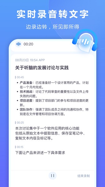 听脑AI app最新版为大家戴爱了只能的语音转文字工具,在各种场合下都可以轻松的进行录音,之后进行转文字都非常的轻松,使用AI进行录音总结很方便的,及时保存识别的内容到本地,想怎么进行使用都可以加的,没有任何的使用限制了。