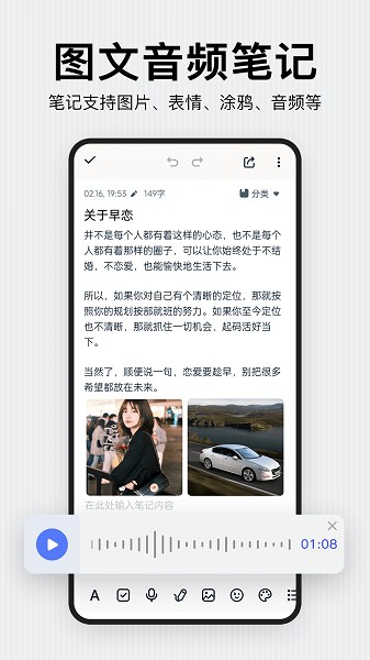 2、在记事的时候可以添加图片、链接等多媒体元素,让记录更加的内容更加丰富了。