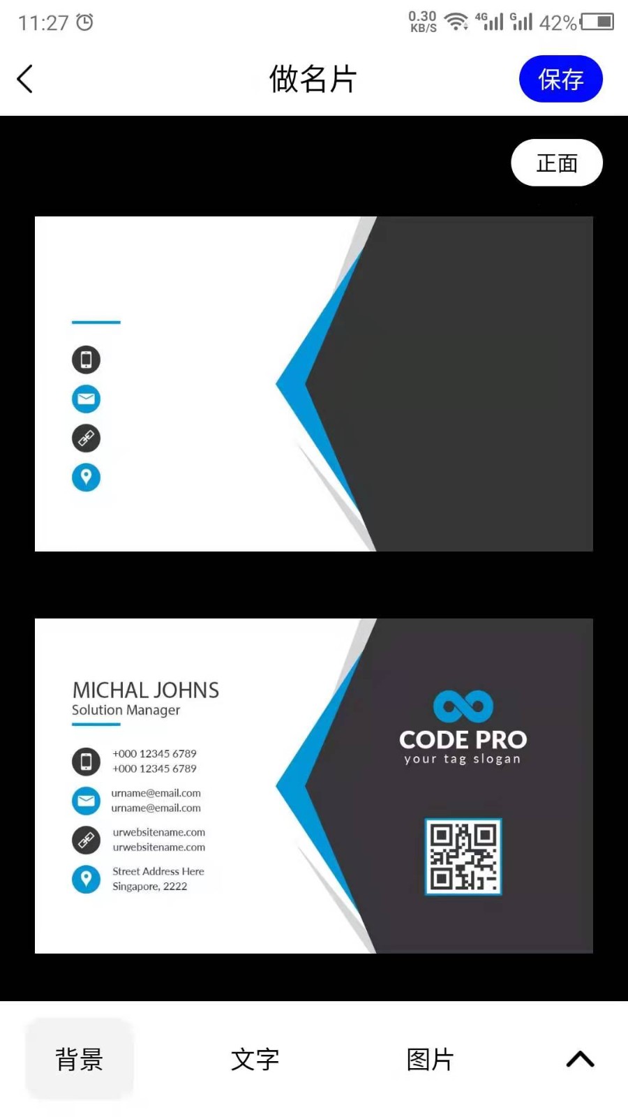 4、即使是设计新手也能在短短一分钟内完成专业级别的名片设计,并且能够随时随地保存、下载以及编辑自己的作品。