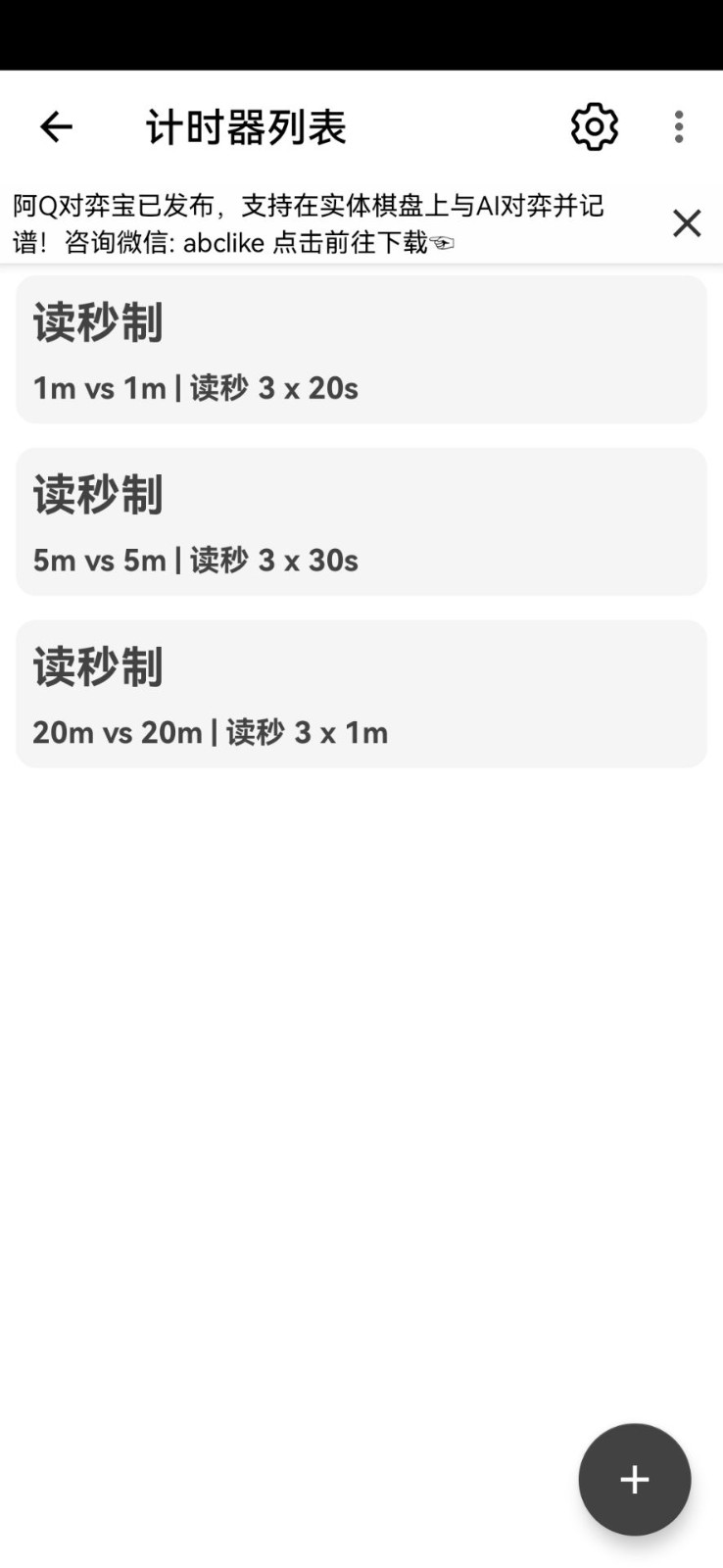 阿Q棋钟app专门为围棋打造的时钟工具,能够在各种比赛中开启计时器,各种时间显示模式都可以进行切换的,还可以开启语音到时候,能够详细统计每一次双方下棋的时间了,带来的各种工具使用起来也是非常便捷的。