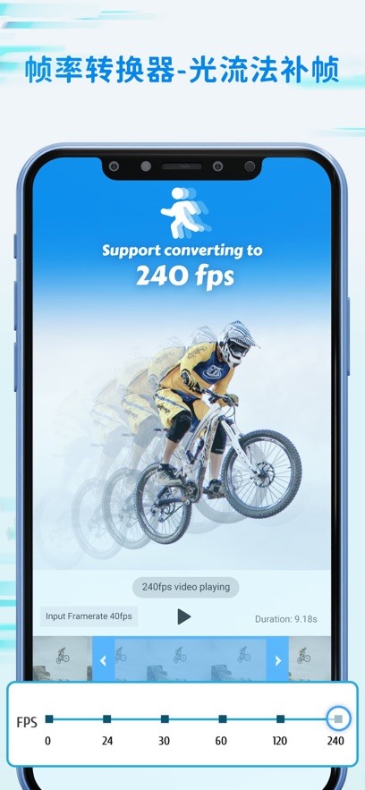 除了将普通视频的帧率提高到60/120/240帧,它还可以将高帧率视频转换为电影级的24帧视频和最常用的30帧视频,以更小的尺寸分享。当你放慢高帧率视频时,其结果将比正常的slomo视频更流畅,没有任何停顿或人们所说的 ""滞后""。当你把高帧率视频变成低帧率时,其大小将更小,易于保存和分享。该应用程序支持处理1至240帧的视频,这意味着由Go pro、行动相机、无人机和所有类型的智能手机拍摄的视频。