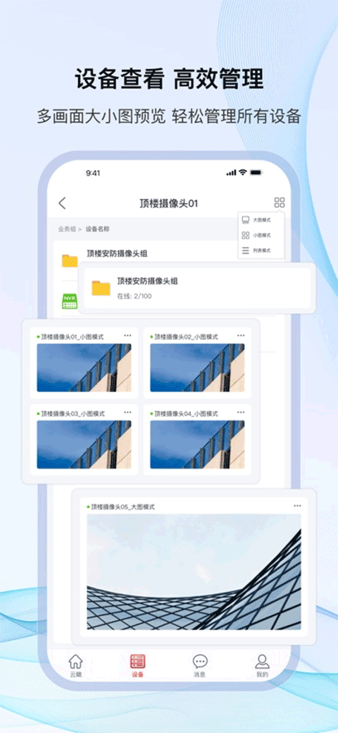 2、即时监控预览:在线设备监控画面即时呈现,多屏同步播放,稳定流畅,尽在掌握。