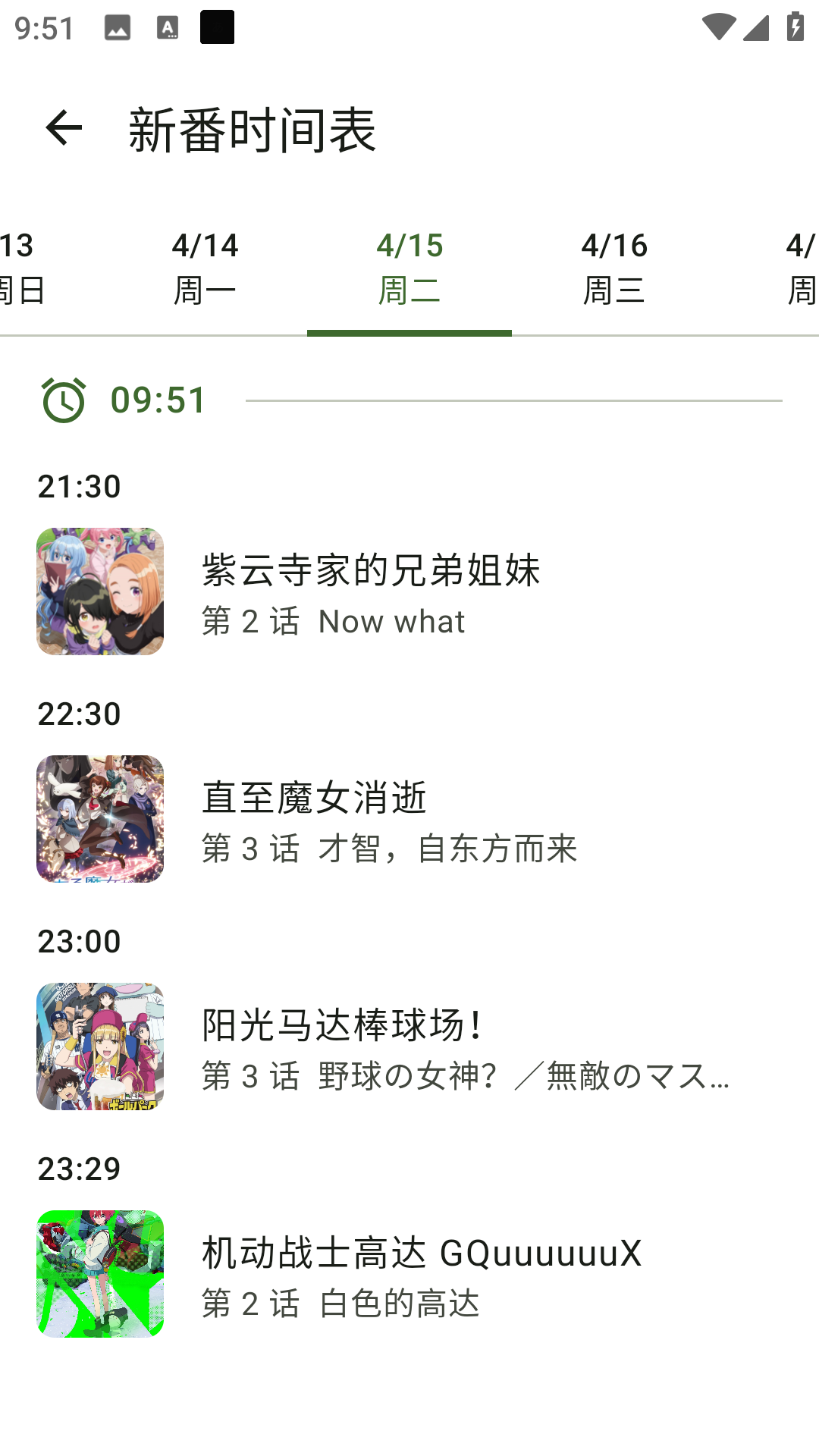 3、新番时间表为漫迷们提供每天动漫更新情况。
