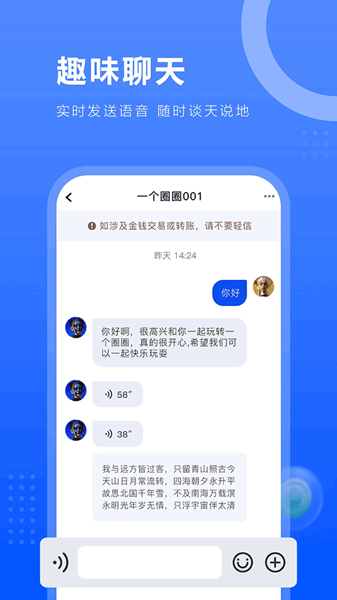 2、IM轻社交:支持随时随地组群畅聊,用户可以和圈友们分享身边趣事,斗图玩梗,结交新朋友。