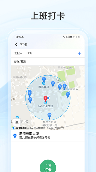 3、内置了移动打卡功能,结合地图上的电子围栏技术,清晰地标示出可打卡的移动范围,能够直观了解并准确完成打卡操作。